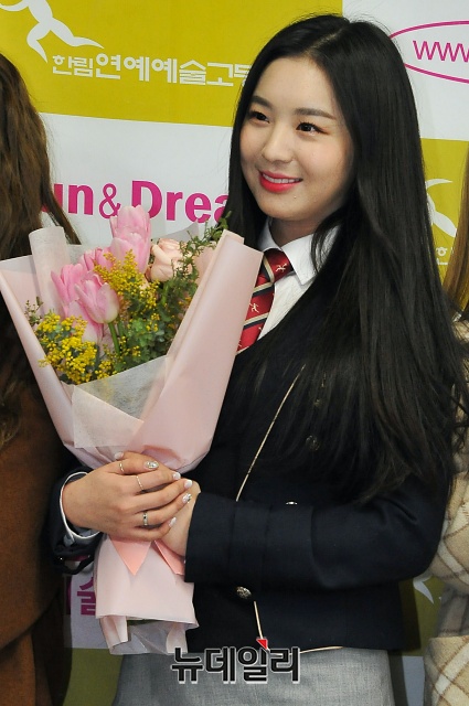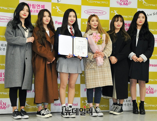 걸그룹 아리아즈의 멤버 주은이 7일 오전 서울 송파구 한림연예예술고등학교 졸업식에서 멤버들과 포토타임을 갖고 있다.