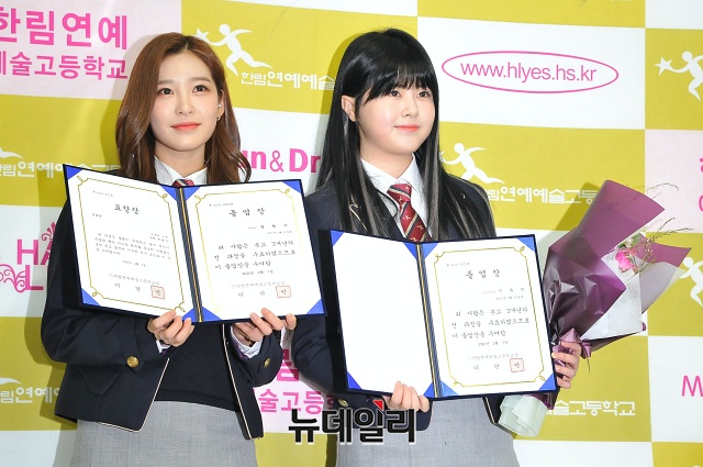 걸그룹 버스터즈의 멤버 형서(왼쪽), 소녀주의보 멤버 샛별이 7일 오전 서울 송파구 한림연예예술고등학교 졸업식에서 포토타임을 갖고 있다.