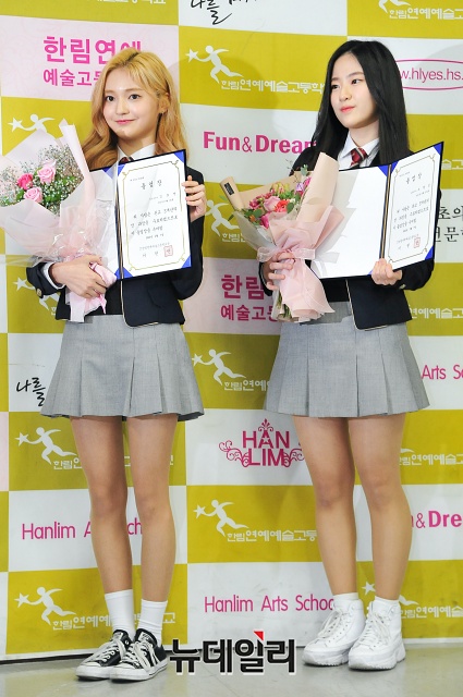 프로듀스 48 출신 연습생 김초연(왼쪽), 조영인이 7일 오전 서울 송파구 한림연예예술고등학교 졸업식에서 포토타임을 갖고 있다.