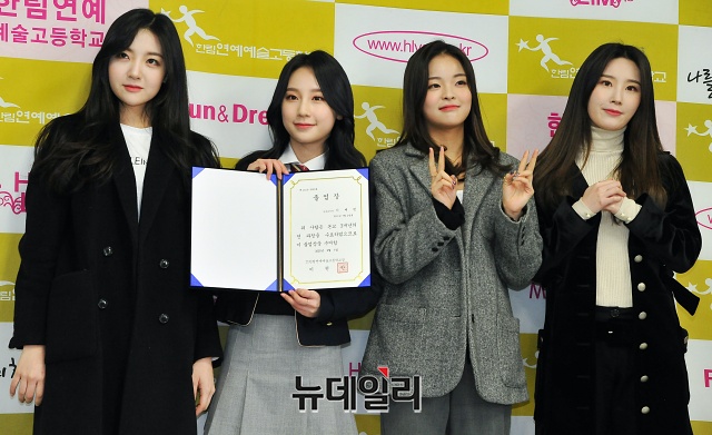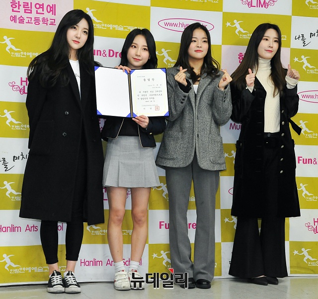 걸그룹 S.I.S의 멤버 세빈이 7일 오전 서울 송파구 한림연예예술고등학교 졸업식에서 멤버들과 포토타임을 갖고 있다.