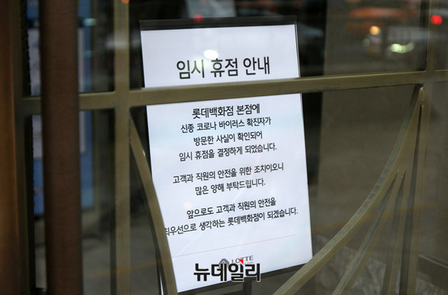 롯데백화점은 이날 오후 질병관리본부로부터 23번 확진자가 이곳을 다녀갔다는 사실을 통보받았다. 백화점과 같은 건물을 사용중인 롯데면세점도 임시휴업에 들어갔다.