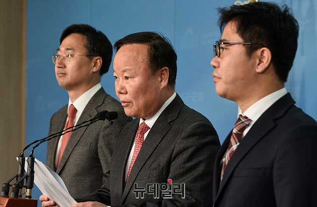 김재원 자유한국당 정책위의장, 한국당 인재영입 6호 신범철 전 아산정책연구원 안보통일센터장(왼쪽), 인재영입 1호 '인권운동가' 지성호 씨가 10일 오전 국회 정론관에서 '국민과 함께하는 2020 희망공약 개발단 외교안보 통일공약'을 발표하고 있다.이날 한국당은 자유대한민국을 위기에 빠뜨리고 있는 문재인 정권의 '4대 안보포기정책(▲ 9.19 남북군사합의서 채택 ▲ 대중(對中) 3不 정책 ▲ 한미연합군사훈련 축소 ▲ 한일군사정보보호협정 파기 번복 사태)', '3대 북한눈치보기 정책(▲ 북한이탈주민 강제북송 ▲ 북한인권재단 출범 저지 ▲ UN북한인권결의안 공동제안국 불참)'을 폐기하고 자유민주적 통일을 견인할 수 있도록 원칙있는 대북정책을 추진하겠다"고 말했다.