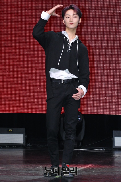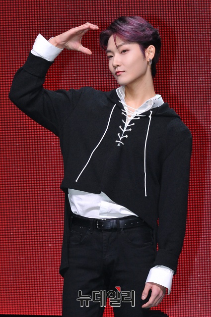 아이돌그룹 ‘더보이즈(THE BOYS)’ 멤버 케빈이 10일 오후 서울 광진구 예스24 라이브홀에서 열린 정규 1집 ‘리빌(REVEAL)’ 쇼케이스에서 포토타임을 갖고 있다.