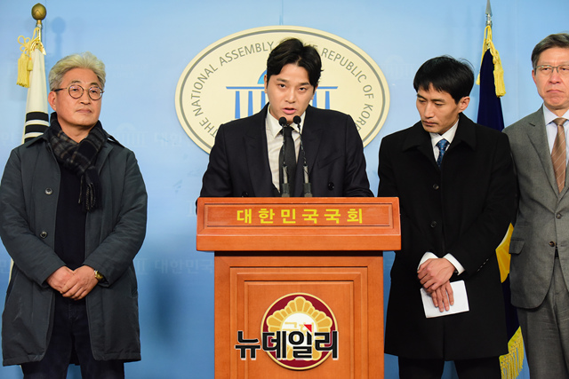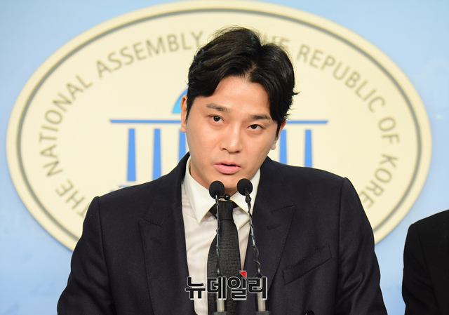 버닝썬 사건 최초제보자인 김상교 씨가 10일 오후 국회 정론관에서 통합신당 참여·지지 입장을 밝히는 기자회견을 갖고 있다.