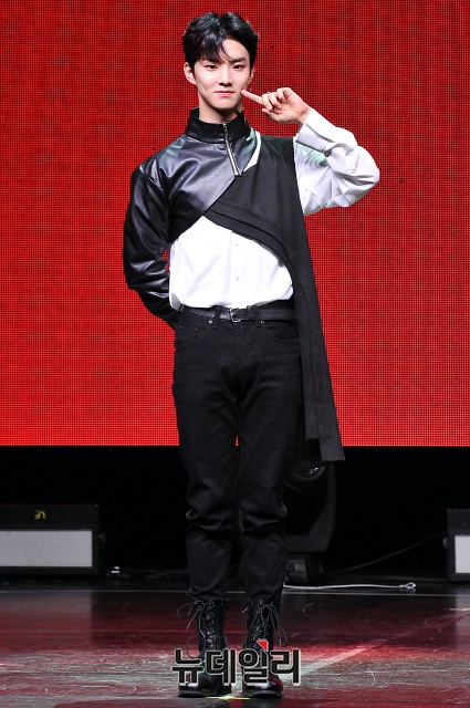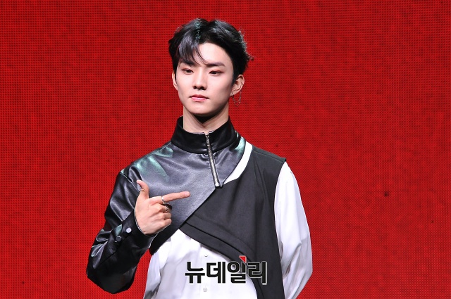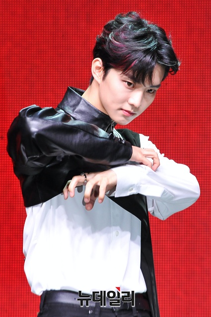 아이돌그룹 ‘더보이즈(THE BOYS)’ 멤버 큐가 10일 오후 서울 광진구 예스24 라이브홀에서 열린 정규 1집 ‘리빌(REVEAL)’ 쇼케이스에서 포토타임을 갖고 있다.