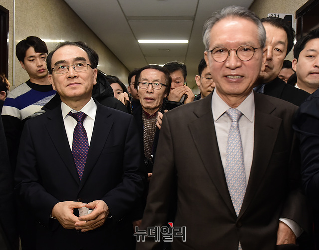 김형오 한국당 공천관리위원장과 태영호 전 주영 북한대사관 공사가 11일 오전 국회에서 열린 태 전 공사의 한국당 입당과 제21대 총선 지역구 후보 출마 발표 기자회견을 마치고 회견장을 나서고 있다.