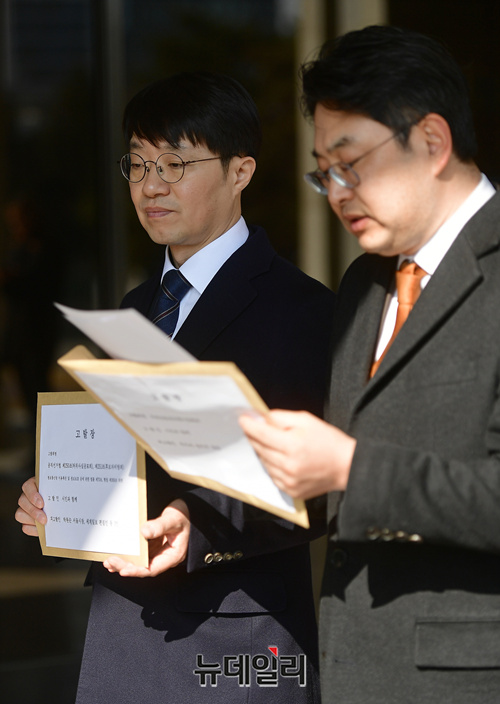 홍세욱(왼쪽부터), 박준섭 시민단체 시민과함께 공동대표와 김형중 사무총장이 11일 오후 서울 서초구 서울중앙지검에서 고발장 제출에 앞서 입장을 밝히고 있다.