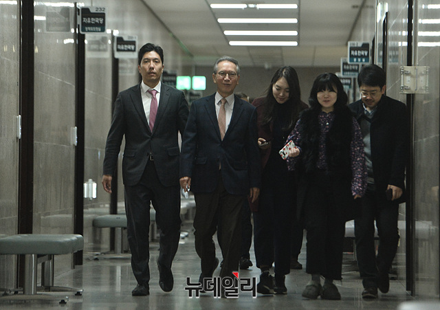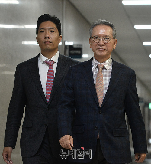 김형오 자유한국당 공천관리위원회 위원장과 송한섭 전 서울서부지방검찰청 검사가 12일 오전 국회에서 열린 송 전 검사의 한국당 입당 기자회견에 입장하고 있다.