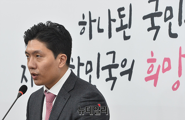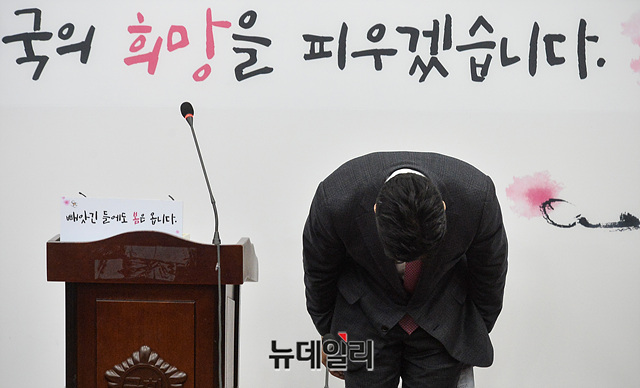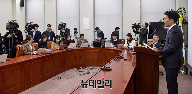 송한섭 전 서울서부지방검찰청 검사가 12일 오전 국회에서 열린 송 전 검사의 '자유한국당 입당 기자회견'에서 인사말을 하고 있다.