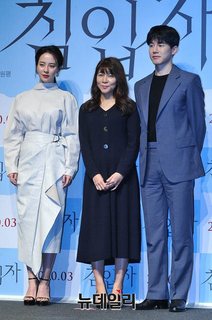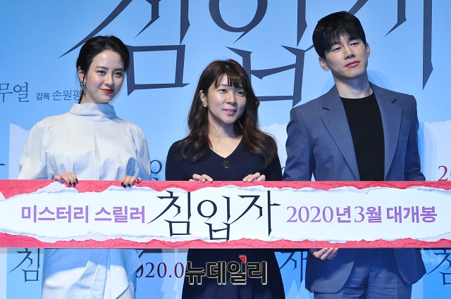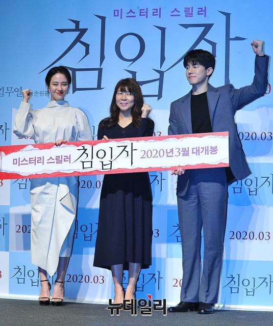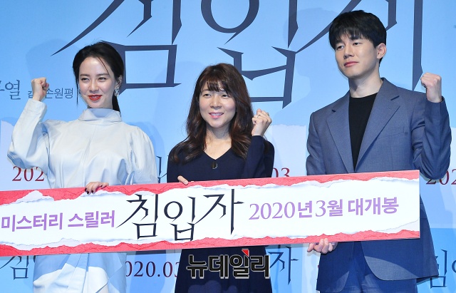 배우 송지효(왼쪽부터), 손원평 감독, 김무열이 12일 오전 서울 강남구 압구정CGV에서 열린 영화 ’침입자(감독 손원평)’ 제작발표회에서 포토타임을 갖고 있다.