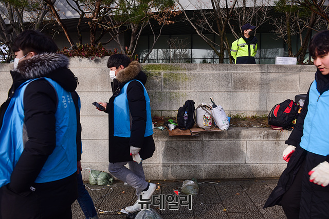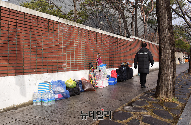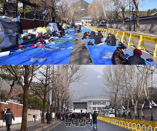 서울 종로구가 13일 오전 청와대 앞 효자로에서 134일째 '문재인 퇴진'을 요구하며 철야농성을 이어가던 범투본 천막을 철거했다. (사진은 철야농성장 점심시간(위), 철거된 철야농성장(아래))종로구청은 이날 7시 24분께 용역업체 직원 및 구청 직원 500여 명과 트럭, 지게차 등 장비 10여 대를 투입해 청와대 사랑채 인근 인도에 설치된 9개 단체의 천막을 모두 철거했다.범투본의 철야농성장은 지난해 10월 3일 개천절, 광화문광장에서 열린 '제1차 문재인퇴진범국민대회' 직후 청와대 쪽으로 가두행진하며 이곳에 자리 잡고 134일째 철야농성을 이어온 곳이다.전광훈 한기총 대표회장을 중심으로 '청와대 광야교회'라 불리며 전국에서 기독교인들이 '문재인 퇴진'을 요구하며 철야기도를 이어온 곳이다. 범투본은 이날 대책회의를 열고, 이후 일정을 논의중이다.