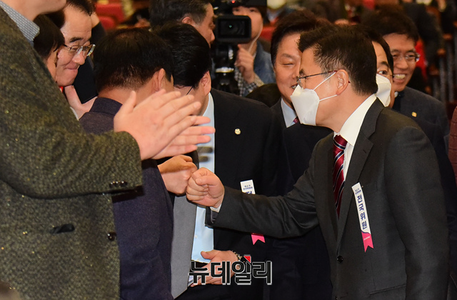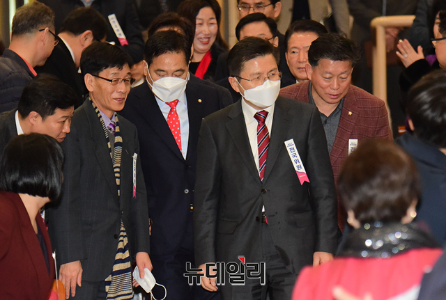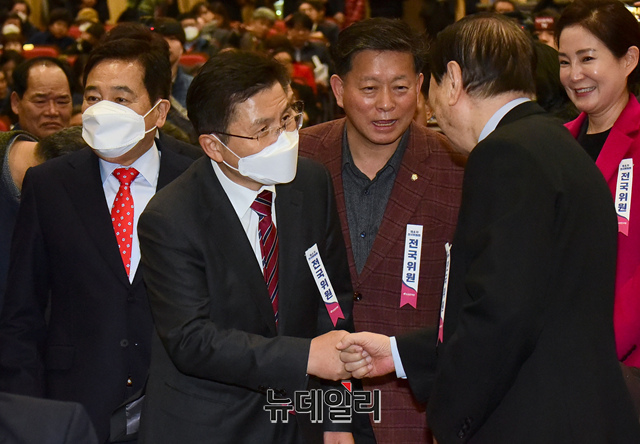 황교안 자유한국당 대표가 13일 오전 국회 의원회관에서 열린 한국당 전국위원회에 참석하며 코로나19 (우한 폐렴) 예방을 위한 주먹인사를 하고 있다.