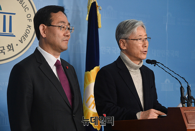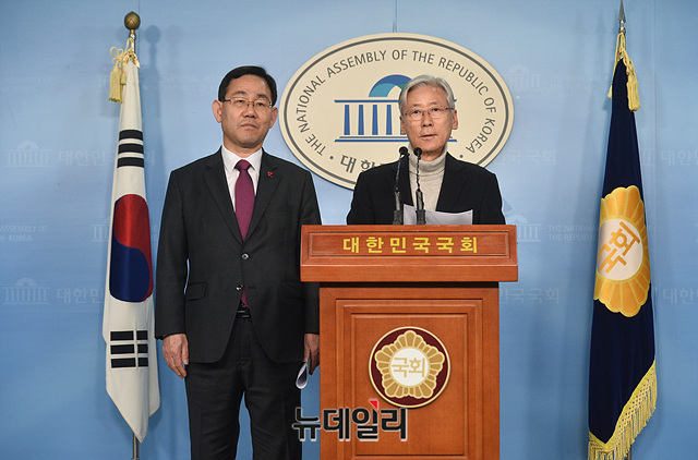 여상규 자유한국당 의원, 주호영 의원이 13일 오후 국회 정론관에서 더불어민주당 판사 출신 영입인재 이탄희, 이수진, 최기상 관련 기자회견을 갖고 있다.