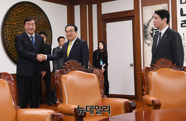 싱하이밍 주한 중국대사가 13일 오전 국회를 찾아 문희상 국회의장을 예방하고 악수를 하고 있다.