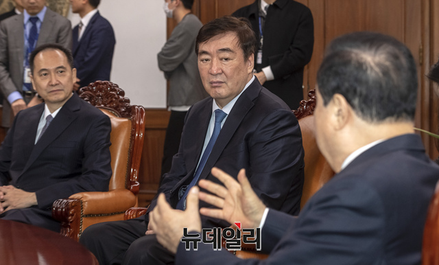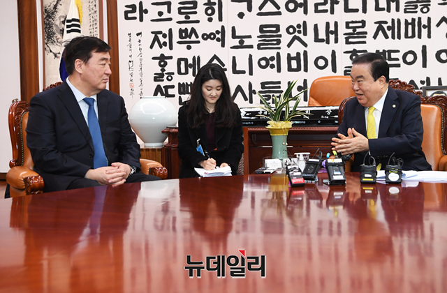 싱하이밍 주한 중국대사가 13일 오전 국회를 찾아 문희상 국회의장과 이인영 더불어민주당 원내대표를 예방하고 환담을 나누고 있다.