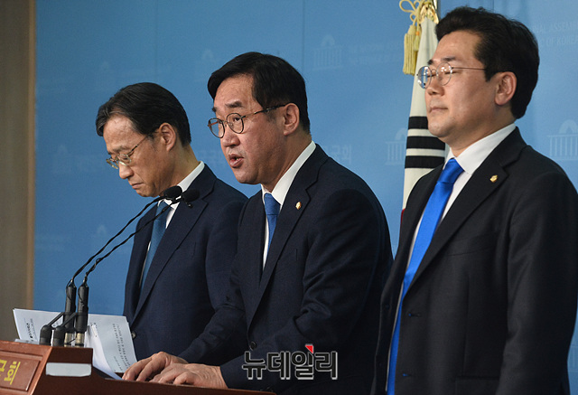 유동수 더불어민주당 의원(왼쪽부터), 박찬대 의원, 맹성규 의원이 13일 오후 국회 정론관에서 '제21대 총선 출마 합동 기자회견'을 갖고 있다.