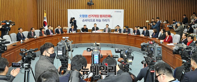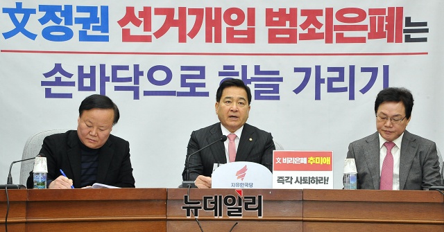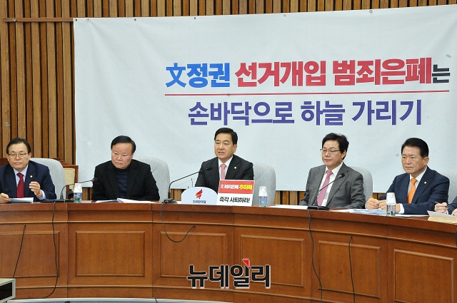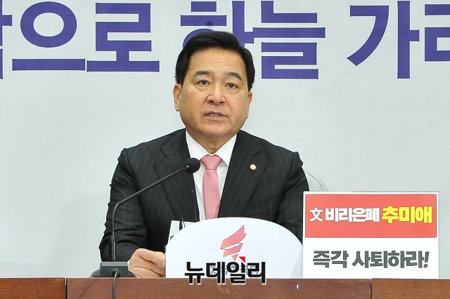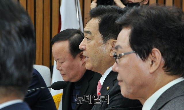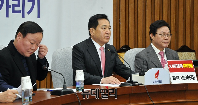 심재철 자유한국당 원내대표가 14일 오전 국회에서 열린 원내대책회의에서 모두발언을 하고 있다.