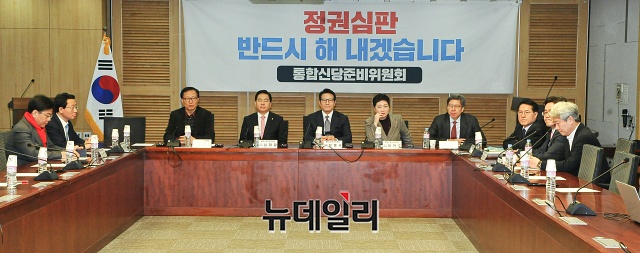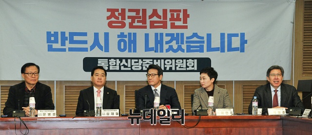 문병호 정치혁신특별위원장(왼쪽부터), 심재철, 정병국, 이언주, 박형준 공동위원장 등 참석자들이 14일 오전 국회 의원회관에서 열린 통합신당준비위원회 6차 회의에서 비공개 회의를 준비하고 있다.