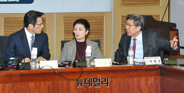 정병국(왼쪽부터), 이언주, 박형준 통합신당 공동위원장이 14일 오전 국회 의원회관에서 열린 통합신당준비위원회 6차 회의에 앞서 논의하고 있다.