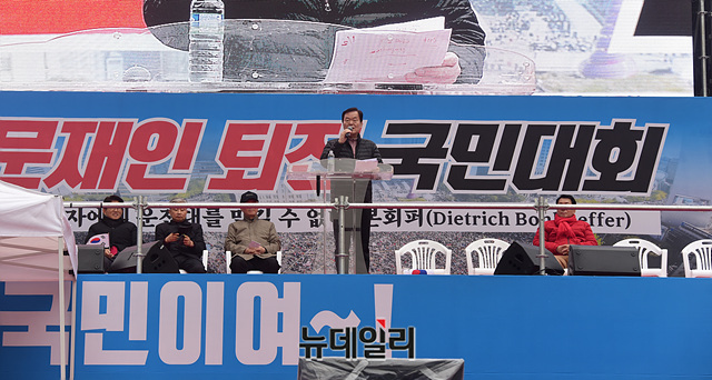 김경재 전 의원이 15일 오후 서울 광화문광장에서 열린 '문재인 퇴진' 국민대회에서 발언을 하고 있다.