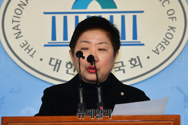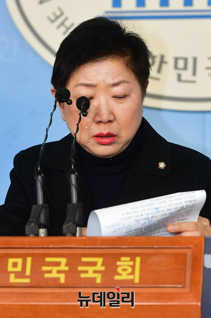 박인숙 자유한국당 의원이 16일 오전 국회 정론관에서 열린 기자회견에서 불출마 선언을 하고 있다. 박 의원은 "이번 총선에 불출마 하지만 이번 총선을 도울것"이라 밝혔다.