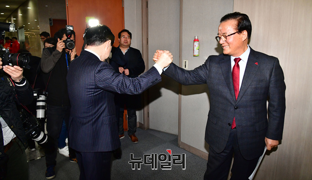 4·15 총선 불출마를 선언한 자유한국당 유기준 의원과 정갑윤 의원이 17일 오전 국회 정론관에서 손을 잡고 서로를 격려하고 있다.