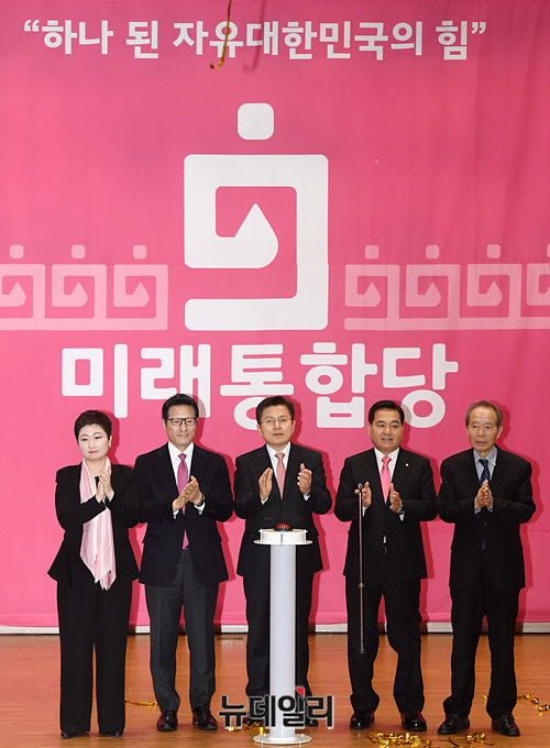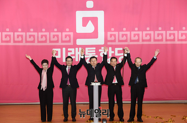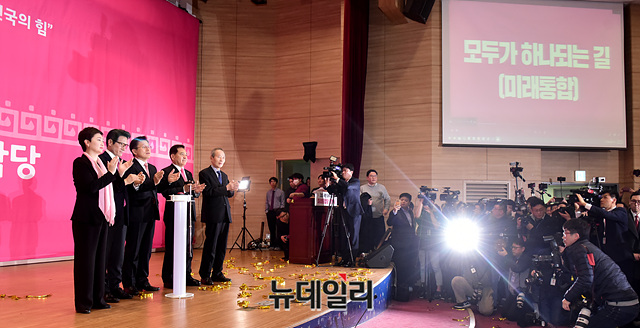 황교안 미래통합당 대표, 심재철 원내대표, 정병국 의원, 이언주 의원, 장기표 위원장이 17일 오후 국회 의원회관에서 열린 미래통합당 출범식 '2020 국민 앞에 하나'에서 손을 맞잡고 기념촬영을 하고 있다.