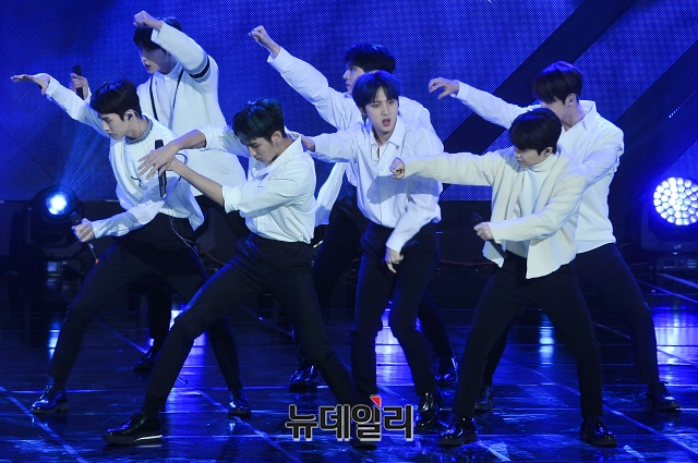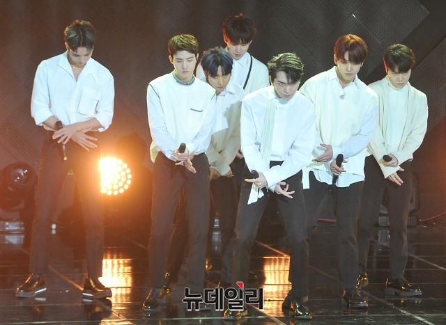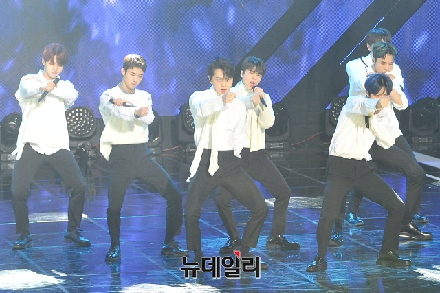 아이돌그룹 펜타곤이 18일 오후 서울 마포구 SBS프리즘타워에서 열린 SBS MTV ‘더 쇼(THE SHOW)’ 생방송에서 무대를 선보이고 있다.