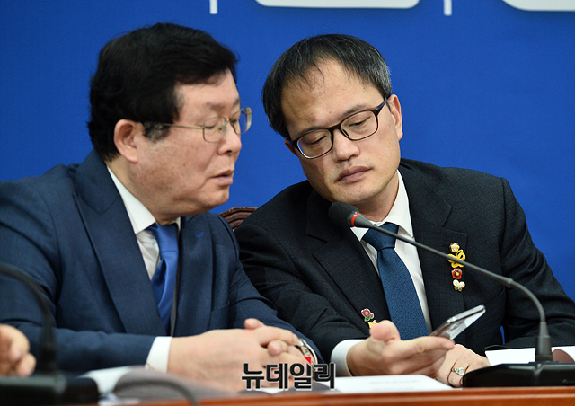 설훈 더불어민주당 최고위원과 박주민 최고위원이 19일 오전 국회에서 열린 최고위원회의에서 휴대전화를 바라보며 대화를 나누고 있다.