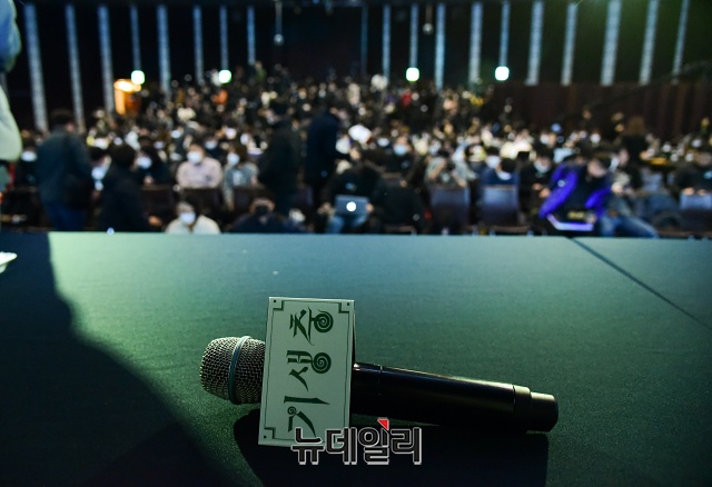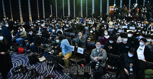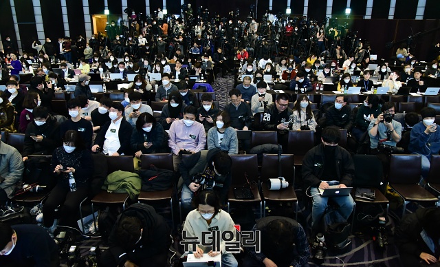 영화 '기생충' 아카데미상 수상을 기념한 기자간담회가 19일 오전 웨스틴조선호텔에서 열린 가운데 취재진들이 봉준호 감독과 배우들을 기다리고 있다.