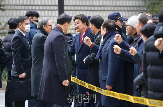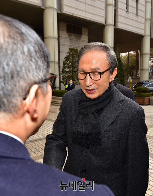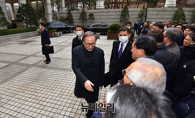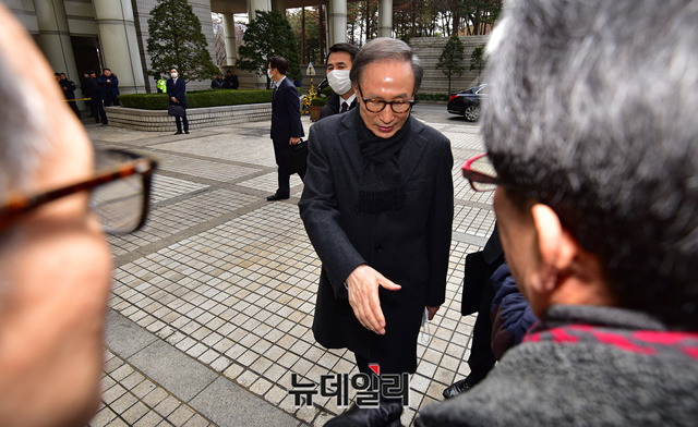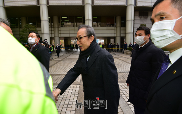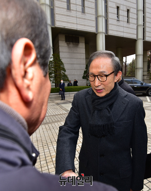 이날 흰색 마스크를 쓰고 차량에서 내린 이 전 대통령은 차량에서 내려 마스크를 벗고, 지지자들에 다가가 일일이 악수를 하며 법정으로 입장했다.