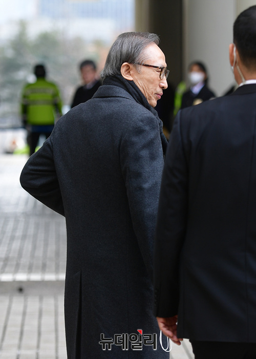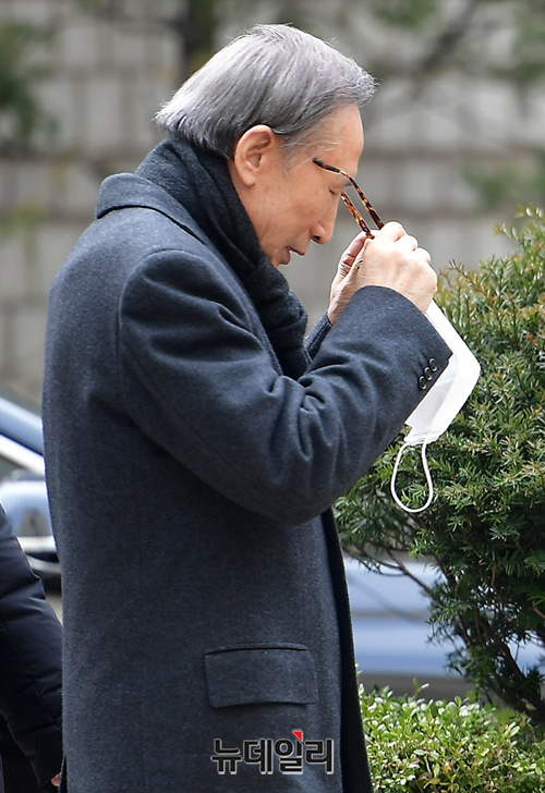 이날 흰색 마스크를 쓰고 차량에서 내린 이 전 대통령은 차량에서 내려 마스크를 벗고, 지지자들에 다가가 일일이 악수를 하며 법정으로 입장했다.