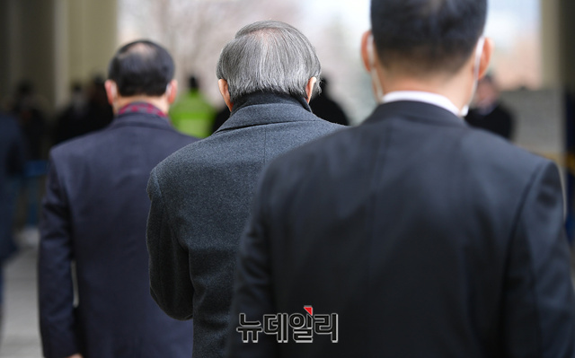 이명박 전 대통령이 19일 오후 서울 서초구 서울고등법원에서 열린 항소심 선고에 출석하기 위해 법정으로 향하고 있다.