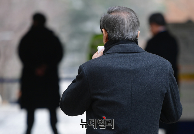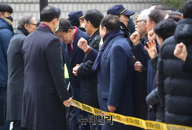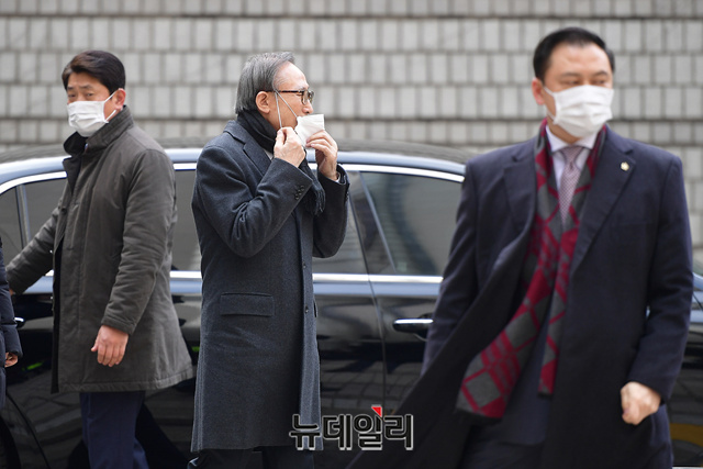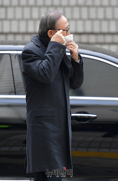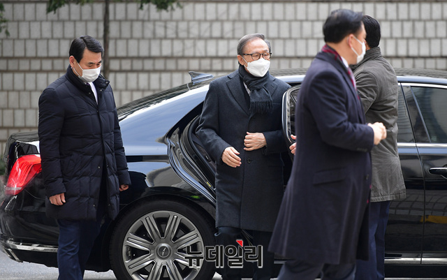이날 흰색 마스크를 쓰고 차량에서 내린 이 전 대통령은 차량에서 내려 마스크를 벗고, 지지자들에 다가가 일일이 악수를 하며 법정으로 입장했다.