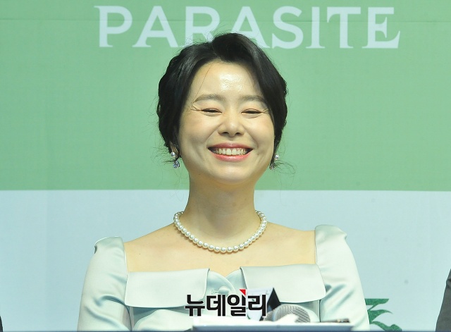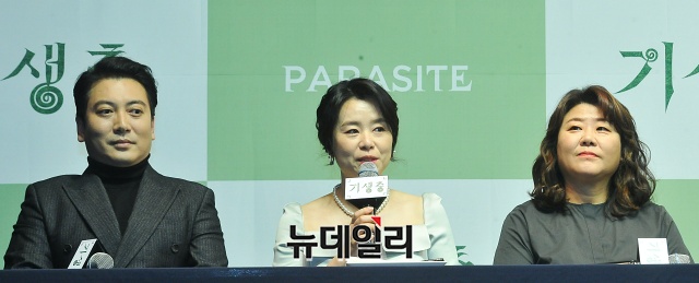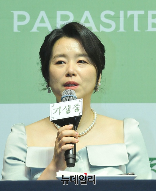 배우 장혜진이 19일 오전 서울 중구 웨스틴조선호텔에서 열린 영화 '기생충' 기자회견에서 취재진의 질문에 답하고 있다.
