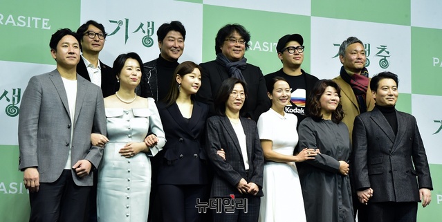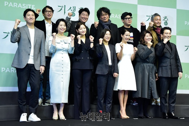 영화 기생충 출연진이 19일 오전 서울 중구 웨스틴조선호텔에서 열린 영화 '기생충' 기자회견에서 포토타임을 갖고 있다.