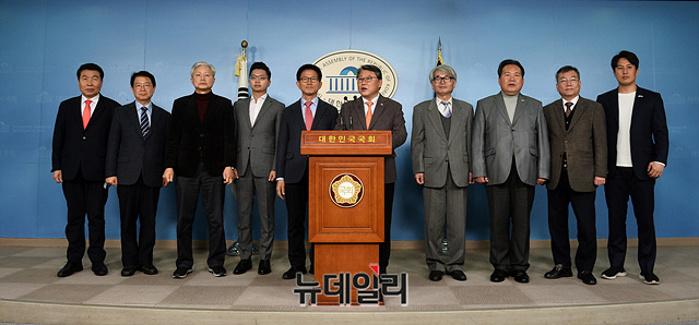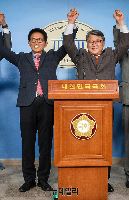 조원진 우리공화당 대표와 김문수 자유통일당 대표가 20일 오후 국회 정론관에서 합당 발표 기자회견에서 손을 맞잡고 기념촬영을 하고 있다.