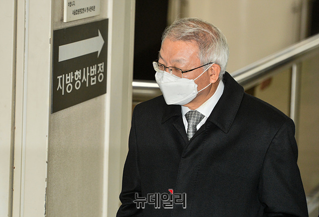 양승태 전 대법원장, 고영한 전 대법관, 박병대 전 대법관이 21일 오후 서울 서초구 서울중앙지법에서 열린 공판에 출석하고 있다. 양 전 대법원장은 폐암수술을 마치고 두달 만에 재판에 출석했다.