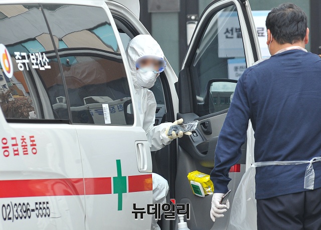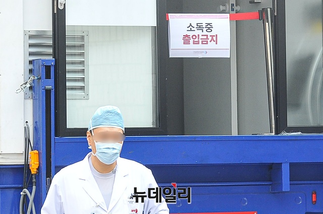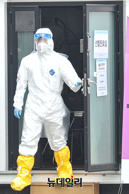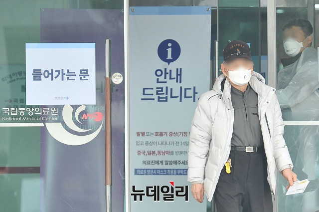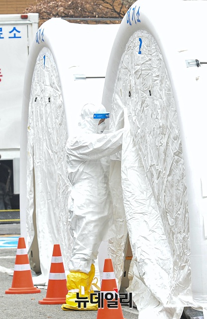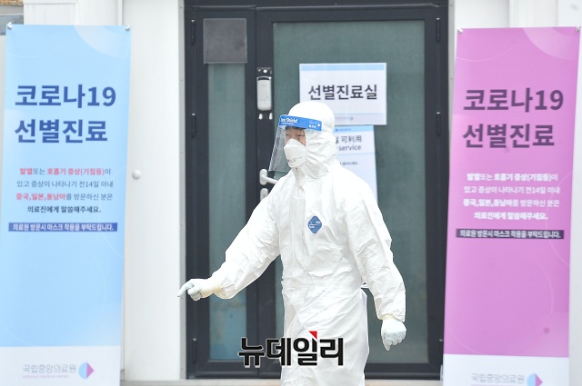 '코로나19(중국 우한 폐렴)' 확진자가 계속 증가하는 21일 오후 서울 중구 국립중앙의료원에서 보호복을 입은 의료진이 선별진료소를 나서고 있다.