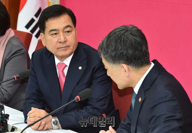 심재철 미래통합당 원내대표가 21일 오후 국회에서 박능후 보건복지부 장관을 만나 코로나19(우한 폐렴)관련 현안 보고를 받고 있다.