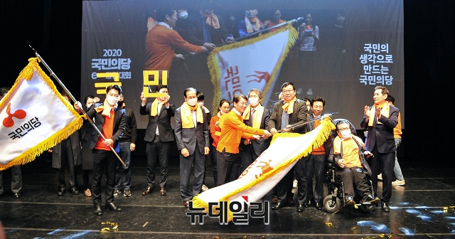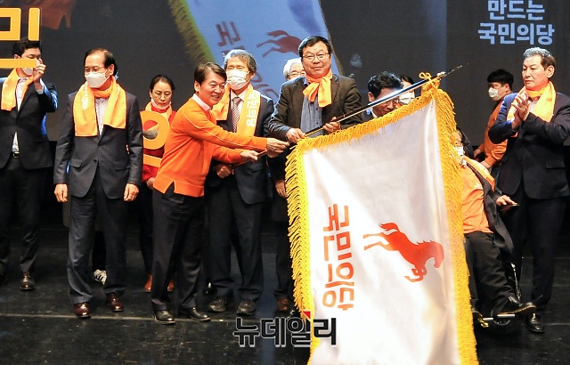 국민의당 초대 당대표로 선출된 안철수 대표가 23일 오후 서울 강남구 SAC아트홀에서 열린 '2020 국민의당 e-창당대회'에서 당대표 선출 직후 당기를 흔들고 있다.