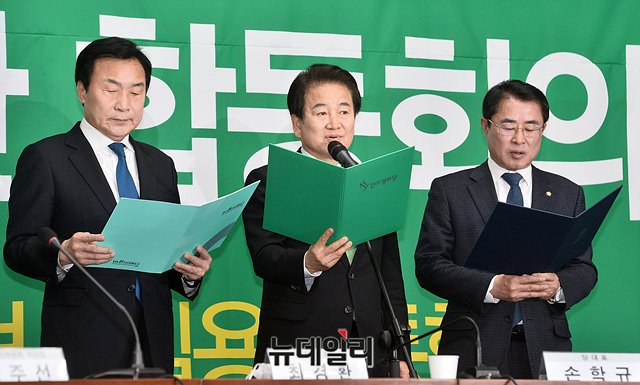 손학규 바른미래당 대표, 최경완 대안신당 대표, 정동영 민주평화당 대표가 24일 오전 국회에서 열린 바른미래당·대안신당·민주평화당 3당 수임기관 합동회의에서 합당 선언문을 낭독하고 있다.