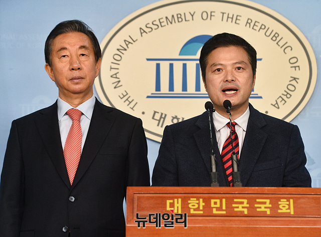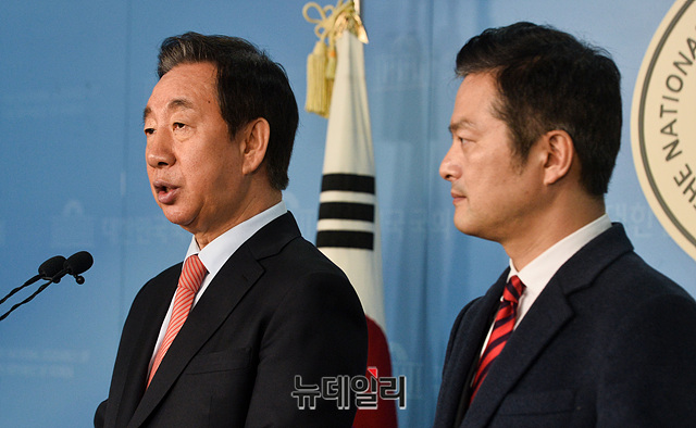[포토] 김태우 출마 선언 기자회견, 포옹하는 '김성태-김태우'