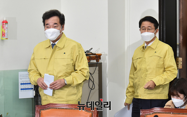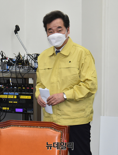 이낙연 더불어민주당 코로나대책특위원장이 24일 오후 국회에서 열린 기자회견에 참석하기 위해 입장하고 있다.