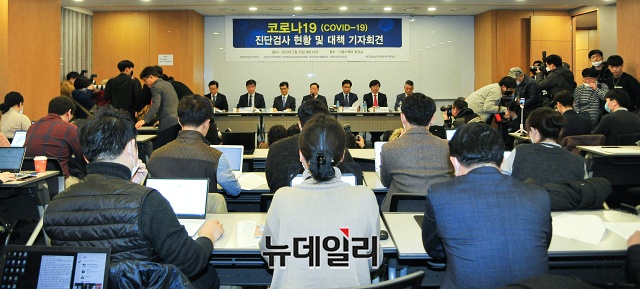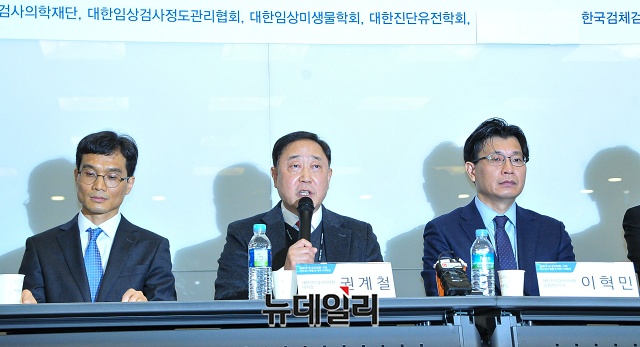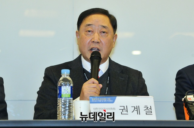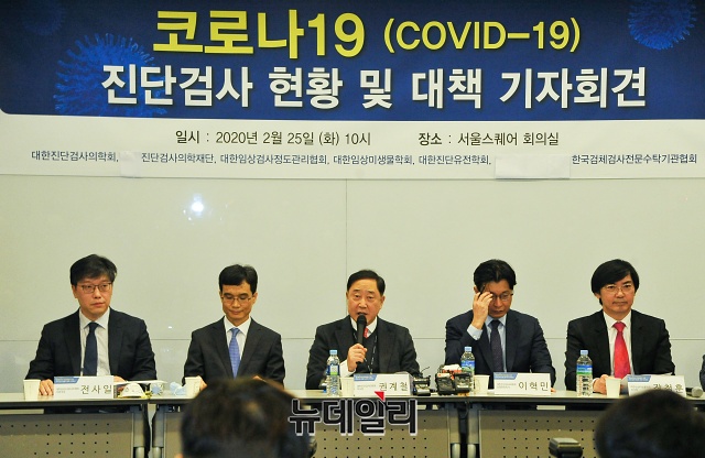 권계철 대한진단검사의학회 이사장이 25일 오전 서울 중구 서울스퀘어 베이징홀에서 열린 '코로나19(중국 우한 폐렴) 진단검사 현황 및 대책 기자회견'에서 발언하고 있다.권 이사장은 "검사 가능 기관 확대로 하루 최대 15,000의 검사를 수행할 것"이라며 "대한진단검사의학회를 포함한 6개 단체(대한진단검사의학회, 진단검사의학재단, 대한임상검사정도관리협회, 대한임상미생물학회, 대한진단유전학회, 한국검체검사전문수탁기관협회)와 같이 정부와 협력해 '코로나19' 극복에 최선의 노력을 다하겠다"고 밝혔다.