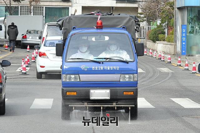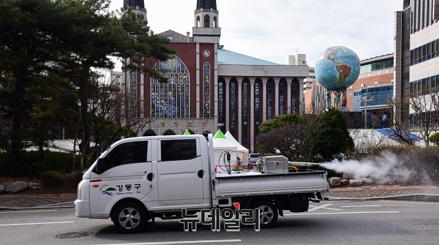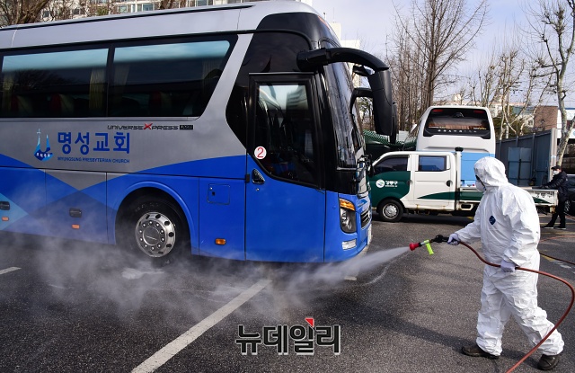 25일 명성교회 부목사가 '코로나19(중국 우한 폐렴)' 확진 판정을 받아 26일 오전 서울 강동구 명성교회 앞에서 강동구 관계자들이 소독하고 있다.