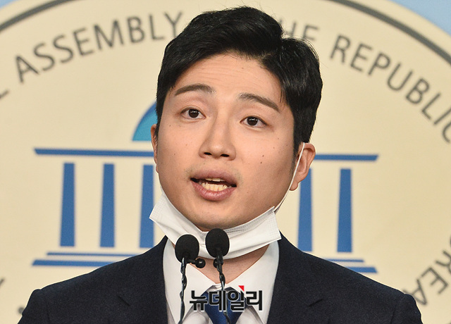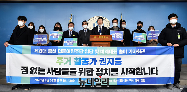권지웅 민달팽이주택협동조합 이사가 26일 오전 국회 정론관에서 더불어민주당 입당 및 비례대표 출마 선언 기자회견을 갖고 있다. 이날 권 이사는 '집 없는 시민 105명'과 함께 민주당에 입당했다.