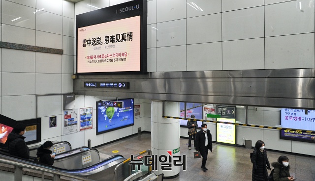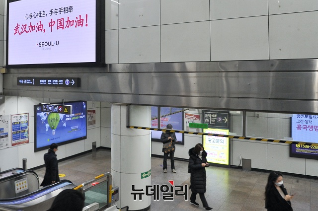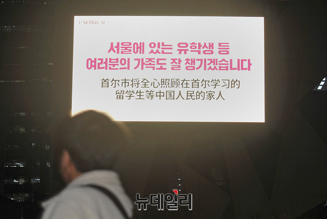 국내 '코로나19(중국 우한 폐렴)' 2번째 사망자가 발생한 지난 21일 오후 서울 중구 서울시청 외벽 전광판에 서울시가 내놓은 중국응원 문구가 게재되고 있다.전광판에는 '서울이 메르스로 고통 받을 때, 베이징이 도왔습니다' '이제 서울이 어려움에 처한 중국과 함께합니다' '설중송탄 환난견진정(어려울 때 서로 돕는다)' '서울에 있는 유학생 등 여러분의 가족도 잘 챙기겠습니다' 등의 문구가 한글과 한자로 게재되고 있다.서울시에 따르면, 시는 지난 15~21일까지 일주일간 서울시청 외관 전광판, 광화문역사 전광판 등 시내 전광판을 통해 중국응원 문구를 송출했다.박원순 서울시장은 21일 오전 서울청사에서 긴급기자회견을 갖고 "코로나는 언젠가 끝나지만 혐오는 남는다"며 중국인에 대한 혐오심을 경계한 바 있다.