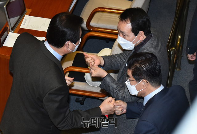김무성 미래통합당 의원이 26일 오전 국회에서 열린 본회의에서 동료의원들과 코로나19(우한 폐렴) 예방을 위한 주먹인사를 하고 있다.