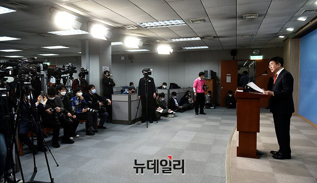 공병호 신임 미래한국당 공천관리위원장이 27일 오후 국회 정론관에서 공천관리위원 발표 기자회견을 갖고 있다.